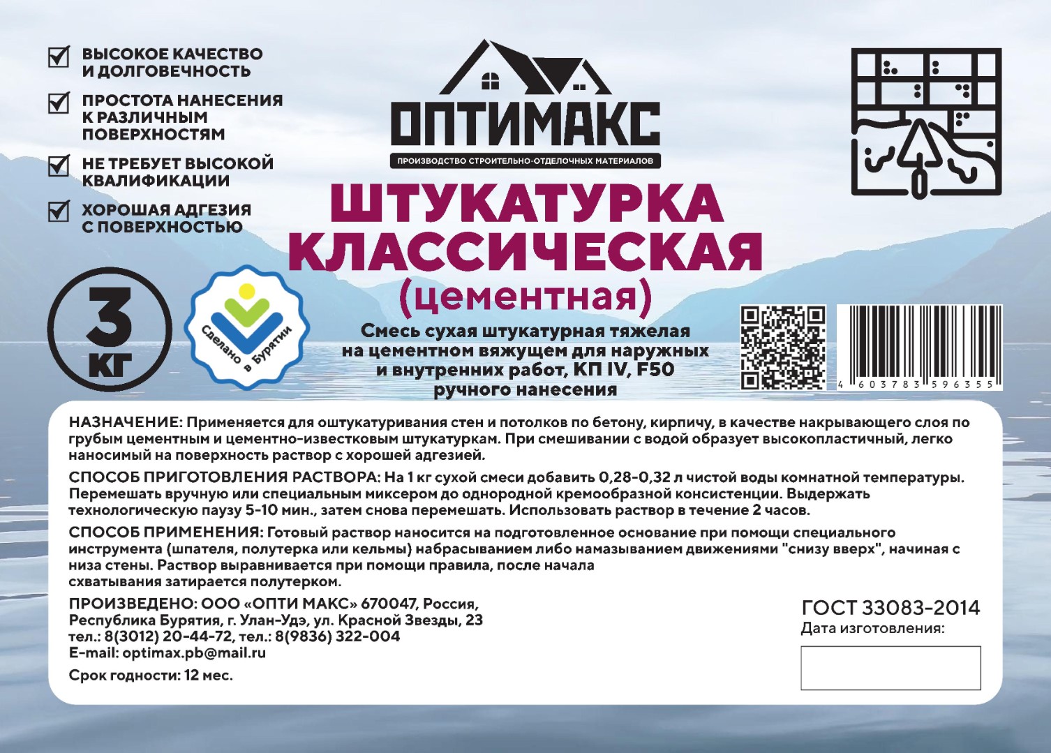 Штукатурка " ОПТИ МАКС Классическая" на цементной основе, фасовка 3 кг