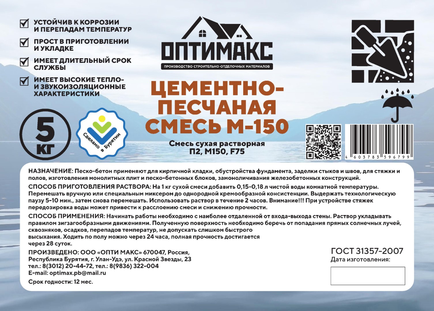 Цементно-песчаная смесь "ОПТИ МАКС" М-150, фасовка 5 кг